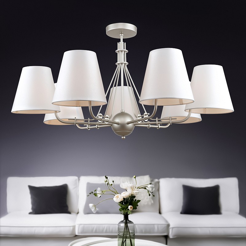 <p>Люстра Rivoli Cara (арт. 2072-307) под 7 ламп Е14 40 Вт выполнена в классическом стиле, при этом прекрасно подойдёт в пространства стилей современная классика или лофт. Серебристый цвет арматуры, минималистичность конструкции и белые тканевые плафоны делают эту люстру потолочную невесомой и гармоничной в любом интерьере. Коллекцию итальянских дизайнеров Rivoli Cara дополняют потолочные люстры под 5 ламп (арт. 2072-305) и настенное бра (арт. 2072-401).</p>