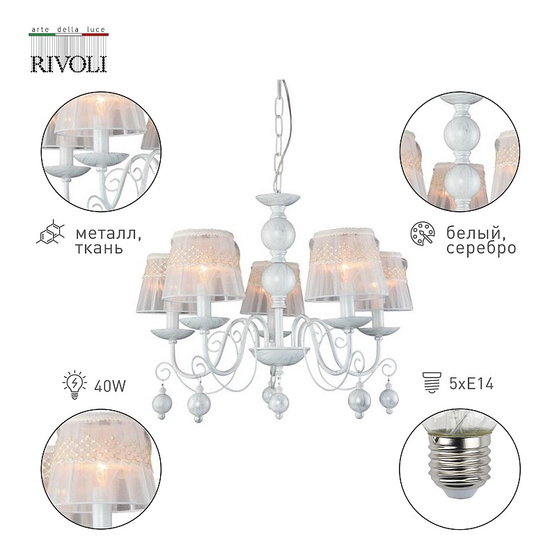 <p>Люстра потолочная Rivoli Aracelis (арт. 2142-205) в классическом стиле. Выглядит легкой и воздушной благодаря светлой цветовой гамме - белая серебристая арматура, белые плафоны из абажурной ткани с декором под тюль. Специальная ткань люстры устойчива к загрязнениям, не накапливает пыль.</p>
