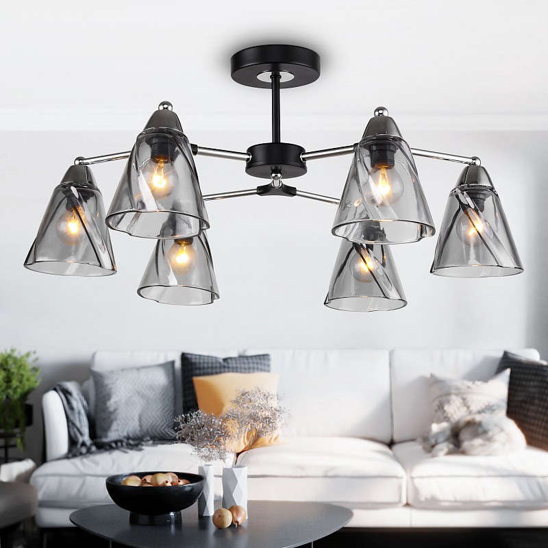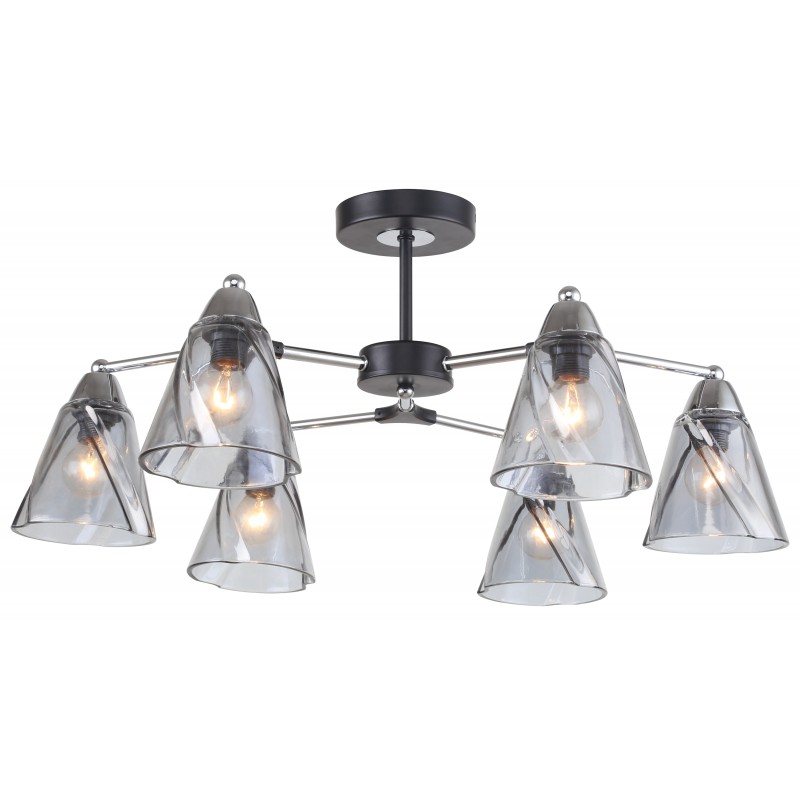 <p>Металлическая потолочная люстра на штанге, выполненная в стиле модерн, станет удачным решением для преображения современной квартиры, дома, общественного пространства. Потолочная люстра с 6 стеклянными плафонами с лёгким затемнением осветит площадь до 18 м2. При этом свет люстры не будет слишком ярким для глаз. Плафоны люстры изготовлены из стекла и радуют аккуратным выдувным декором. Черный корпус люстры дополнен элементами цвета хром.</p>