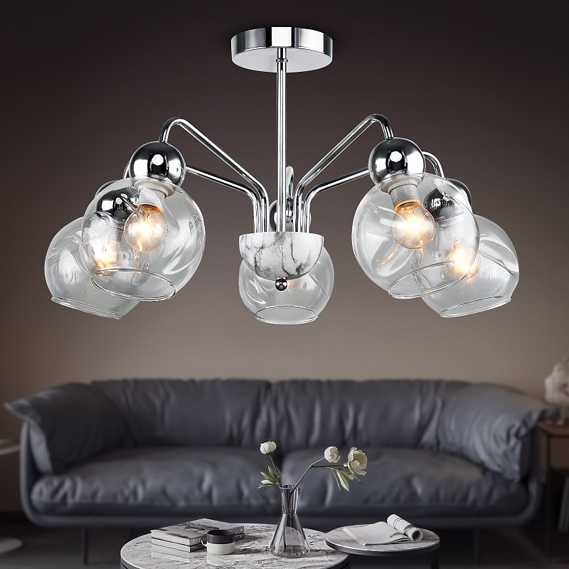 <p>Металлическая люстра потолочная Rivoli Dena (арт. 3147-305) цвета хром с эффектным декоративным элементом под мрамор. Прочная люстра из металла на штанге прослужит долго. 5 стеклянных плафонов люстры создают яркое широкое освещение на площади до 15 м2. Минималистичные хромированные рожки люстры отлично смотрятся в современных интерьерах. Купить потолочные люстры на штанге стоит в пространства стилей модерн, минимализм, классика, современная классика, кантри. Если нужна люстра с большим количеством плафонов, рассмотрите модель Rivoli Dena под 7 ламп – арт. 3147-307. Если ищете настенные светильники, в комплект к люстрам есть бра Rivoli Dena – арт. 3147-401.</p>