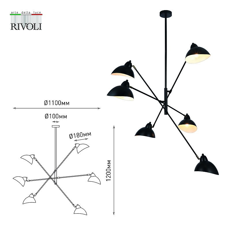 <p>Люстра потолочная на металлической штанге с плафонами, расположенными на разной высоте - Rivoli Adelaide (арт. 4103-306). Люстра с металлическими плафонами выполнена в чёрном цвете. Над козырьками плафонов – миниатюрные декоративные элементы в цвете медь. В ассортименте итальянского бренда Rivoli есть аналогичная потолочная люстра в белом цвете – Rivoli Hattie (арт. 4102-306). Такие люстры потолочные идеальны для интерьеров в стиле лофт, лофт-кантри, скандинавский, минимализм. Люстры на штанге потолочные – настоящий тренд, которого придерживаются профессиональные дизайнеры, чтобы создать яркие и функциональные пространства. Количество плафонов данной люстры – 6. Применяется с лампами Е14 40 Вт. </p>