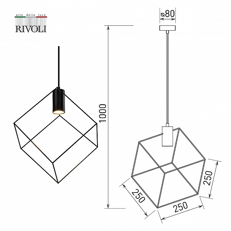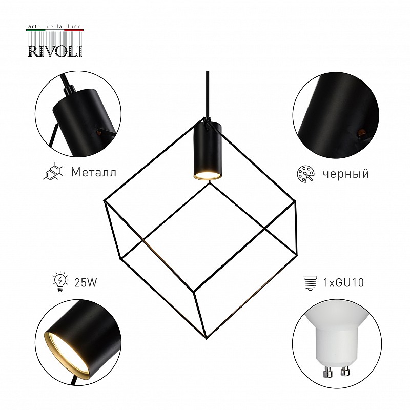 <p>Rivoli Ella - геометричный подвесной светильник с абажуром в виде металлического куба. Металлические светильники потолочные подвесные - прекрасное решение для кухни, прихожей, для стилей лофт, минимализм. Подойдут такие подвесные светильники на тросах в детскую комнату для подростка, в молодежную квартиру-студию. Подвесные светильники Ella, размещенные над столом - отличная дополнительная подсветка столешницы. Хорошее интерьерное решение - купить несколько подвесных светильников Ella и подвесить их в один ряд либо группой. Аккуратный патрон подвесного светильника-люстры Ella Rivoli предназначен для лампы GU10 25 Вт. Подвесные светильники Ella Rivoli выполнены в базовом черном цвете. Металл корпуса легкий и прочный, высококачественный провод. </p>