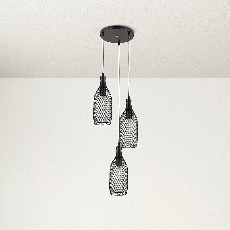 <p>Оригинальные дизайнерские подвесы с металлическими плафонами бутылочной формы. Изготовлены на высококачественном оборудовании методом точечной сварки. Торжество идеальной удлинённой формы и самобытного рисунка-сетки. Коллекция представлена подвесом на 3 лампы.</p>