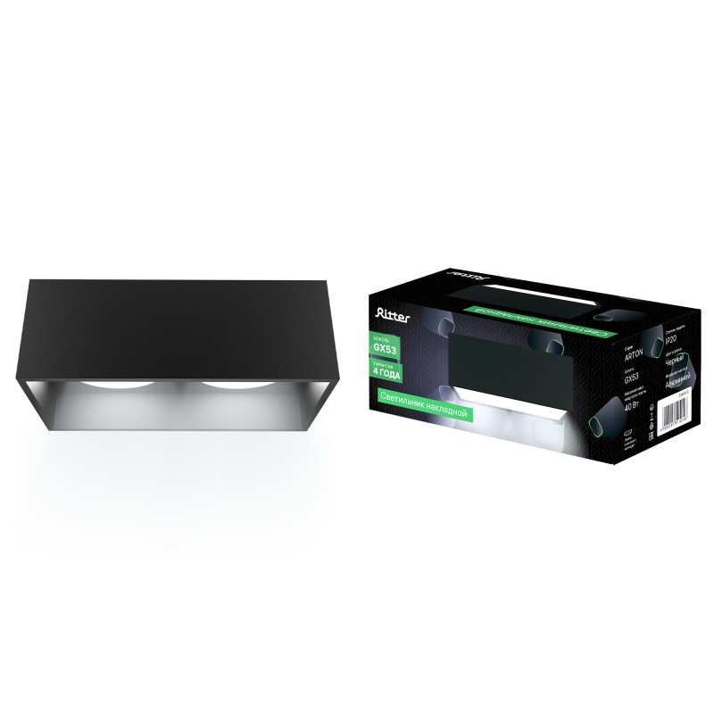 Наименование для 1С | Свет-к накладной, ARTON, прямоугольник, 200х100х80мм, 2хGX53, алюминий, черный, 51404 6, Ritter |