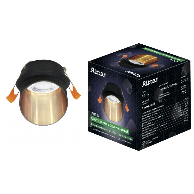 51414 5 Светильник встраиваемый, ARTIN, цилиндр, 68х68х68мм, монтажное отверстие 65х65мм, GU5.3, алюминий, черный/золотой, 51414 5, Ritter, 4008297514145