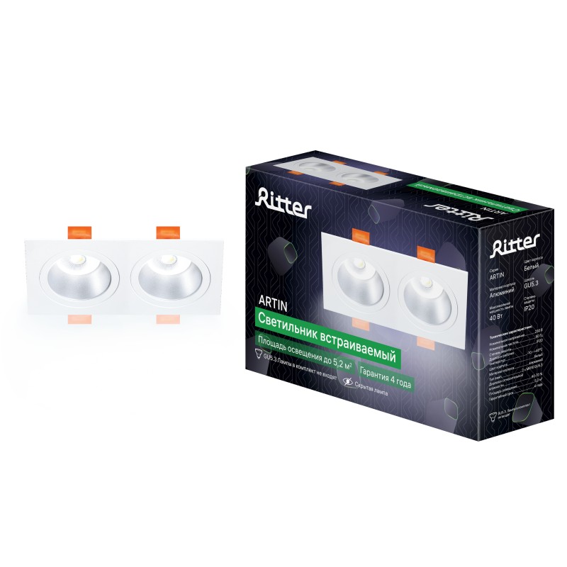 Наименование для 1С | Свет-к встр-й ARTIN скрыт прям-к 175х92х40мм монтаж отв-е 80х150мм 2хGU5.3 Al белый 51419 0 Ritter |