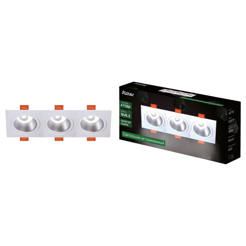 51421 3 Светильник встраиваемый, ARTIN, скрытая лампа, прямоугольник, 260х92х40мм, монтажное отверстие 80х230мм, 3хGU5.3, алюминий, белый, 51421 3, Ritter, 4008297514213