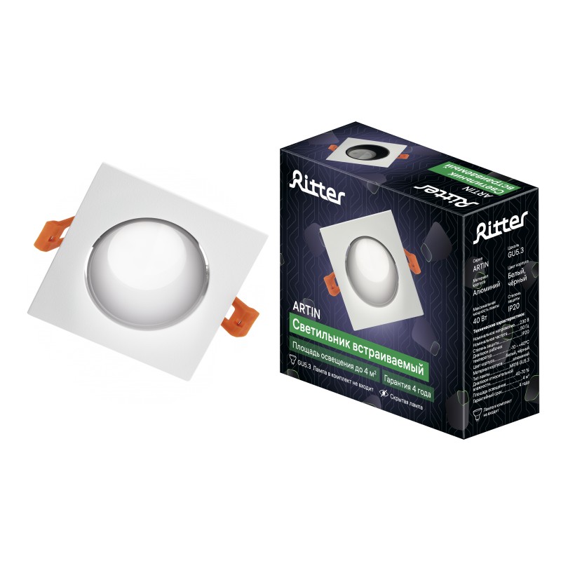 Наименование для 1С | Свет-к встр-й, ARTIN, скрыт ламп квадр 90х90х30мм монтаж отв 75х75мм GU5.3 Al белый 51430 5, Ritter |