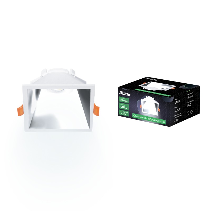Наименование для 1С | Свет-к встр-й, ARTIN, скрыт ламп квад 84х84х35мм монтаж отв 75х75мм GU5.3 пласт бел 51439 8, Ritter |