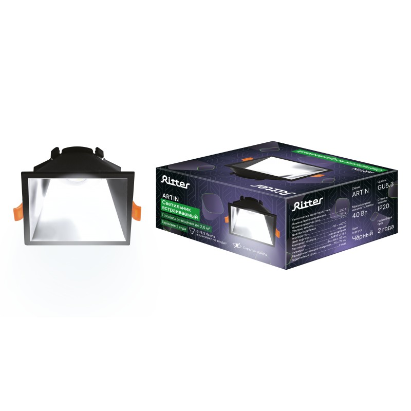 Наименование для 1С | Свет-к встр-й, ARTIN, скрыт ламп квадр 84х84х35мм монтаж отв 75х75мм GU5.3 пласт чер 51440 4, Ritter |