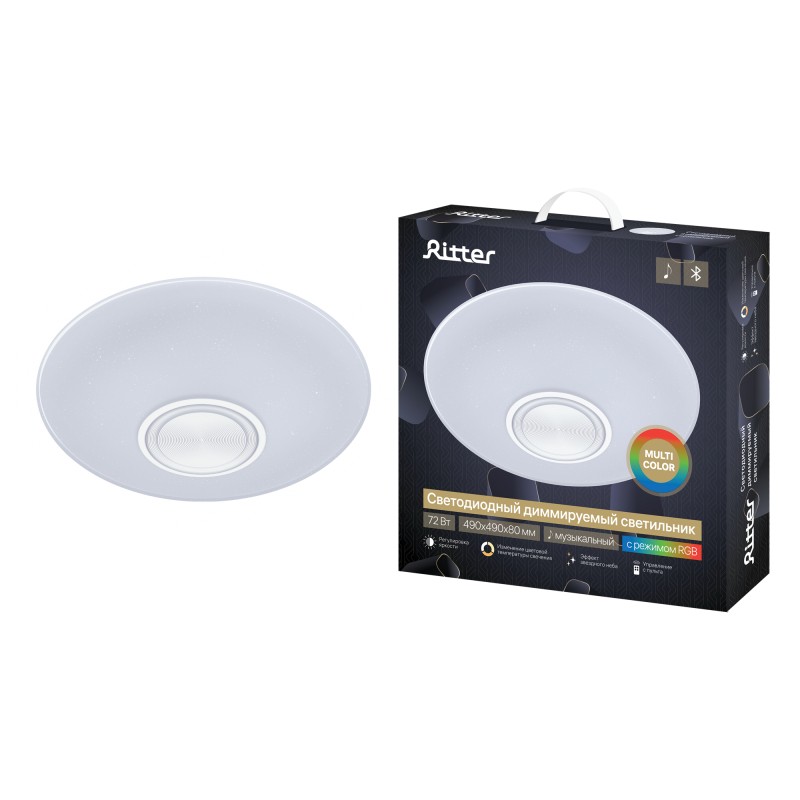 Наименование для 1С | Свет-к потол сд дим DANCE BS, ДУ RGB и Bluetooth Ø490х80мм 72Вт 2700-6400К 25м² бел 52340 6, Ritter |