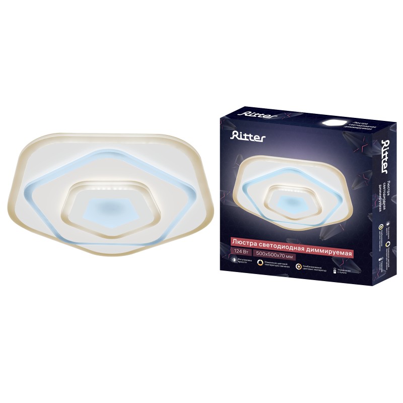 Наименование для 1С | Люстра потолоч светодиодн диммир, KOLAR, ДУ 3 режима 500х500х70мм 124Вт 40м² белый 52371 0, Ritter |