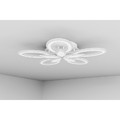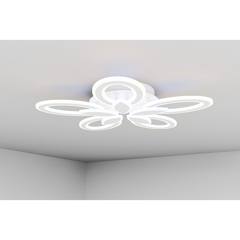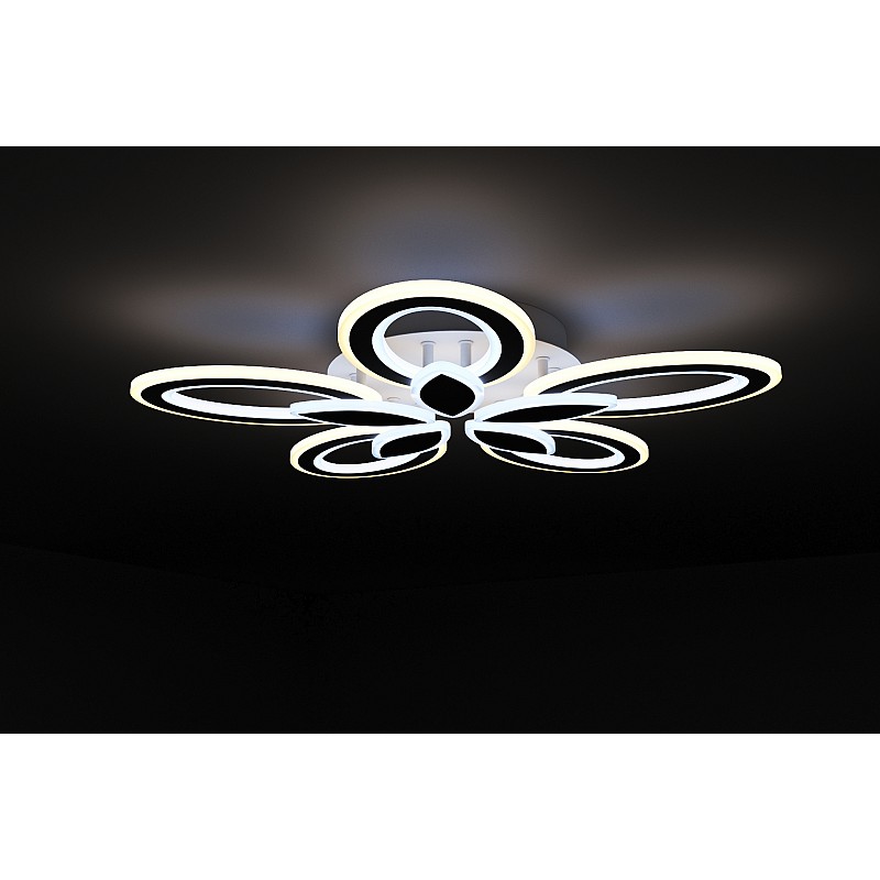 Основание выполнено из металла, а белые плафоны в виде симметричных лепестков из акрила расположены на двух уровнях.