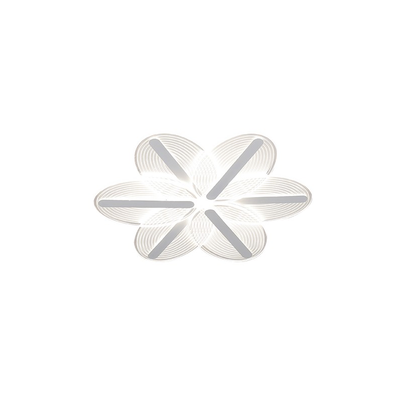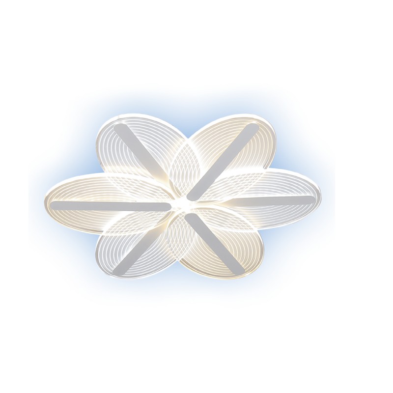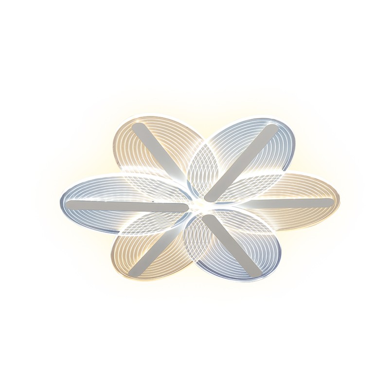 Основание выполнено из металла, а белые плафоны в виде симметричных лепестков из акрила.