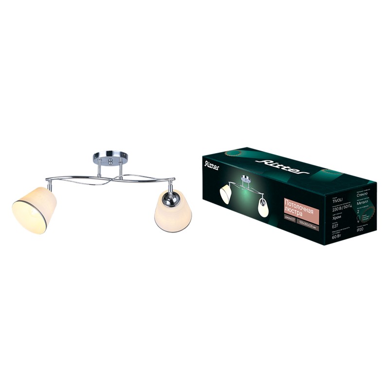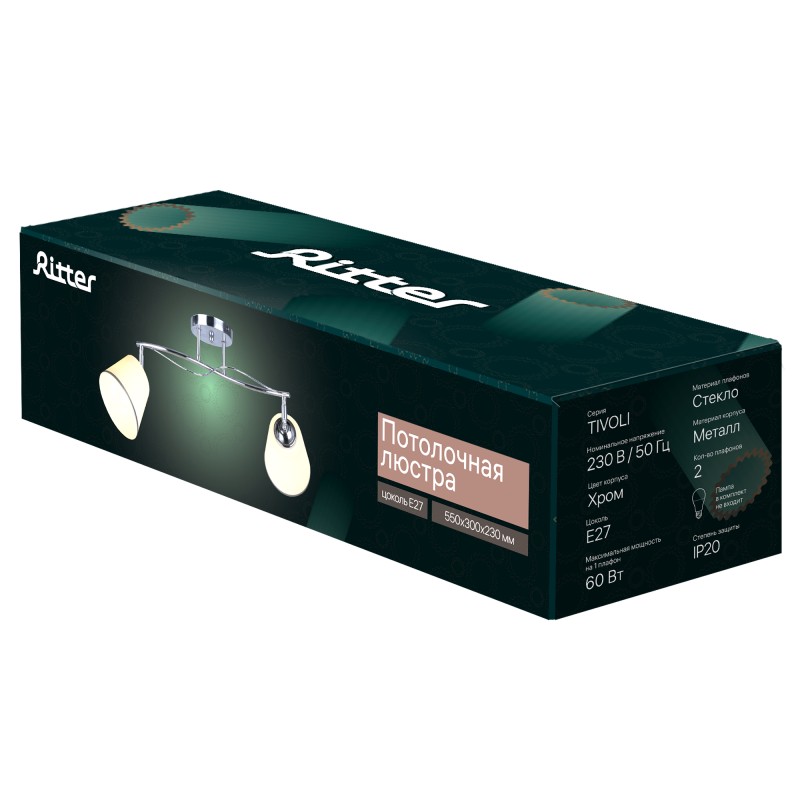 Наименование для 1С | Люстра потолочная, TIVOLI, 550х300х230мм, 2хЕ27, металл, стекло, хром, 52525 7, Ritter |