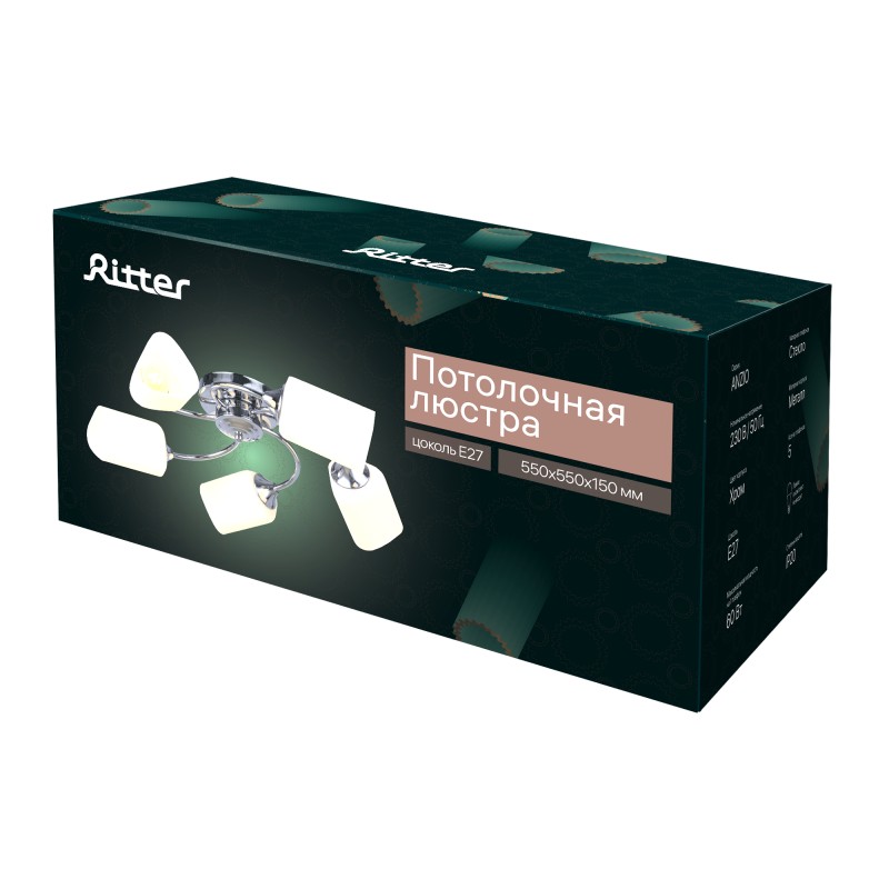 Наименование для 1С | Люстра потолочная, ANZIO, 550х550х150мм, 5хЕ27, металл, стекло, хром, 52528 8, Ritter |