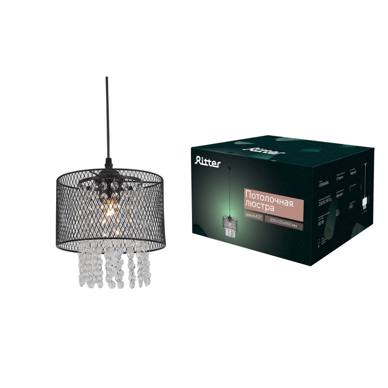 Наименование для 1С | Люстра подвесная, FERRARA, 200х200х900мм, E27, металл, черный, 52534 9, Ritter |