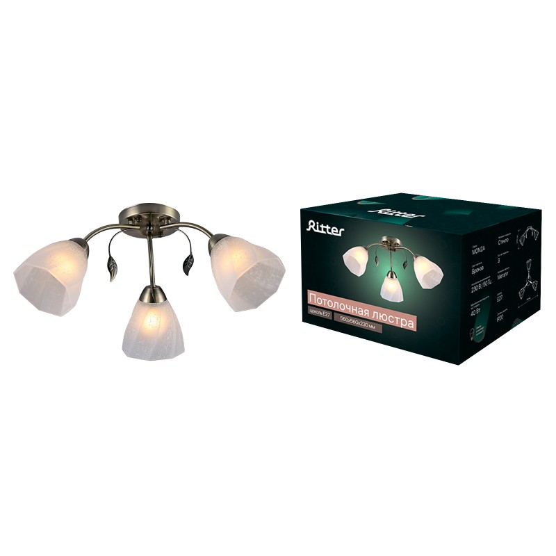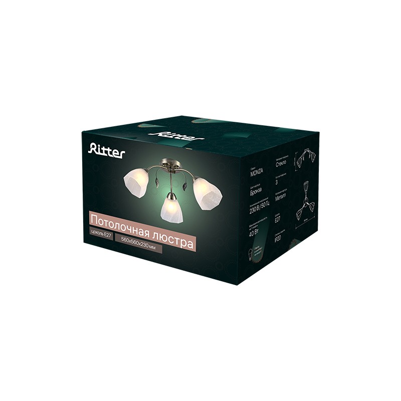 Наименование для 1С | Люстра потолочная, MONZA, 560х560х230мм, 3хE27, металл, бронза, 52539 4, Ritter |