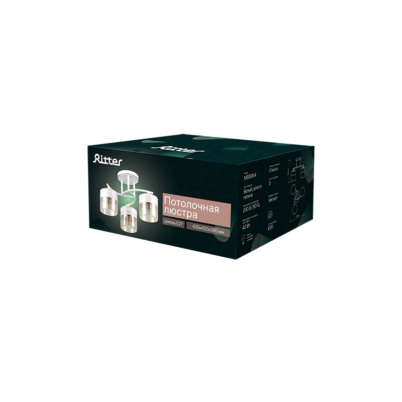 Наименование для 1С | Люстра потолочная, MESSINA, 420х420х260мм, 3хE27, металл, белое золото, 52549 3, Ritter |