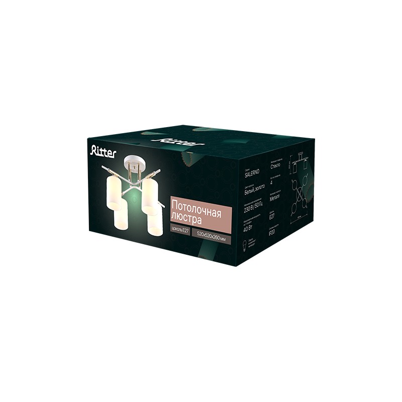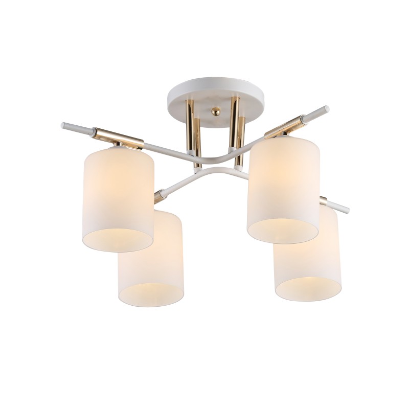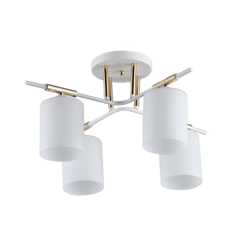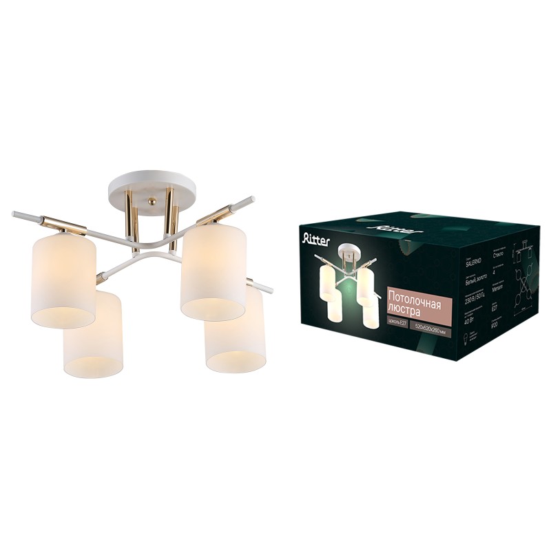 "Потолочная люстра серии SALERNO на четыре плафона предназначена для общего освещения. Выполнена в белом металлическом корпусе с элементами золотистого цвета. Стандартный цоколь Е27 позволяет использовать светодиодные лампы и лампы накаливания до 40 Вт.