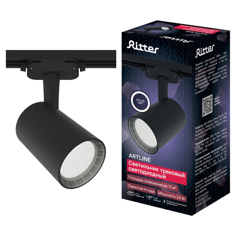 - 59735 7 Светильник трековый, накладной, светодиодный, ARTLINE, поворотный, антибликовый, цилиндр, 75x75x115mm, 20Вт, 1700Лм, 4000К, 230В, алюминий, 11м², черный, 59735 7, Ritter