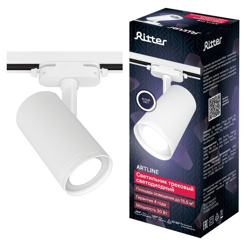 - 59739 5 Светильник трековый, накладной, светодиодный, ARTLINE, поворотный, с регулировкой фокуса, цилиндр, 80х170mm, 30Вт, 2380Лм, 4000К, 230В, алюминий, 15,5м², белый, 59739 5, Ritter