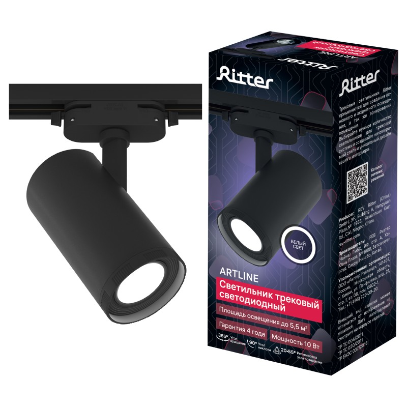 - 59740 1 Светильник трековый, накладной, светодиодный, ARTLINE, поворотный, с регулировкой фокуса, цилиндр, 57x57x135mm, 10Вт, 850Лм, 4000К, 230В, алюминий, 5,5м², черный, 59740 1, Ritter