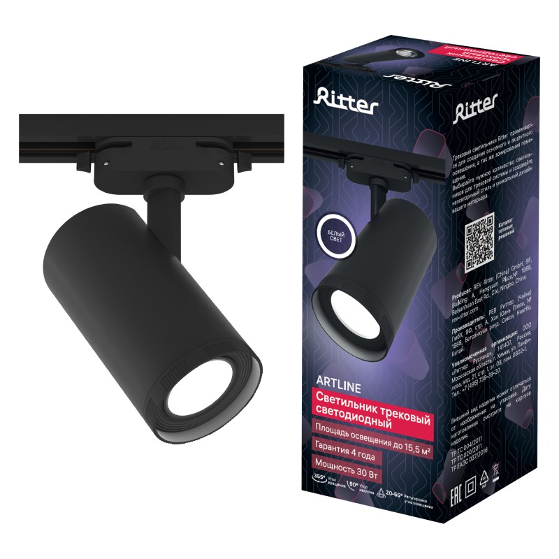 - 59742 5 Светильник трековый, накладной, светодиодный, ARTLINE, поворотный, с регулировкой фокуса, цилиндр, 80х170mm, 30Вт, 2380Лм, 4000К, 230В, алюминий, 15,5м², черный, 59742 5, Ritter
