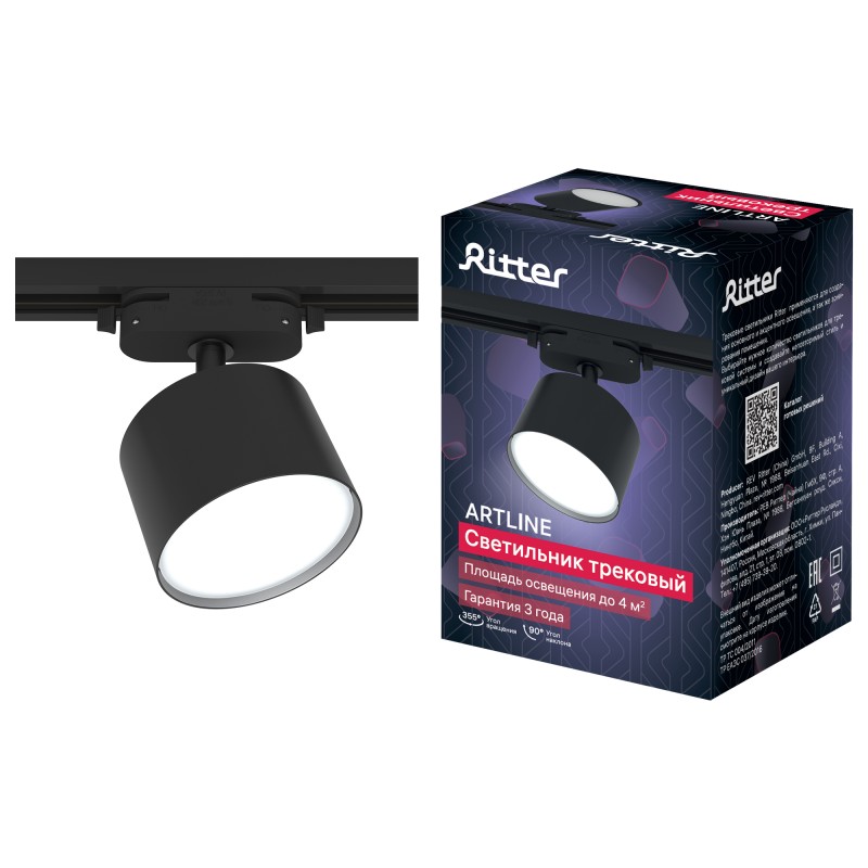 59858 3 Светильник трековый, накладной, ARTLINE, поворотный, цилиндр, 85x55mm, GX53, 230В, алюминий, 4м², черный, 59858 3, Ritter