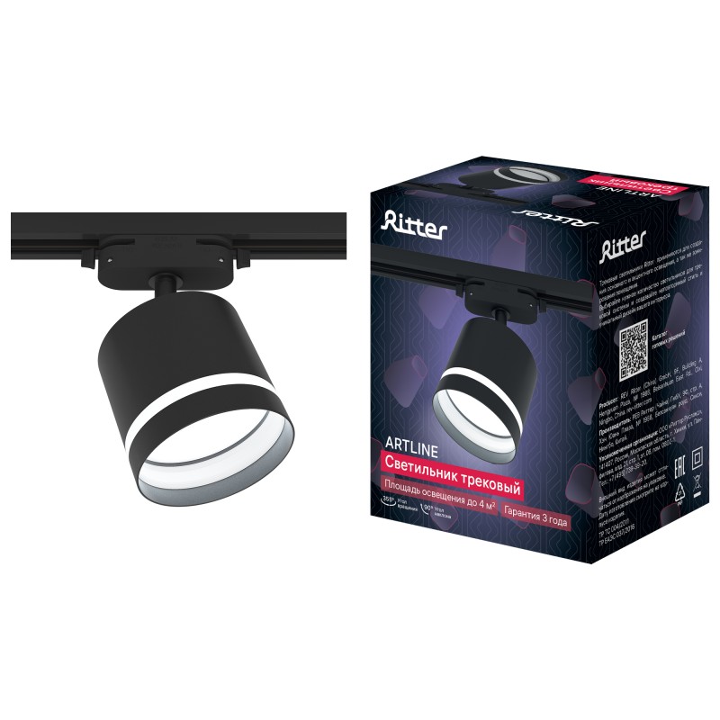 59866 8 Светильник трековый, накладной, ARTLINE, поворотный, цилиндр, 85x80mm, GX53, 230В, алюминий/пластик, 4м², черный, 59866 8, Ritter