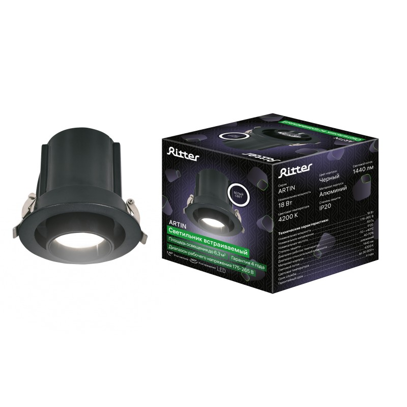 Наименование для 1С | Св-к встр-й, ARTIN, выдвижн поворотн цилиндр 115х120мм LED 18Вт 1440Лм 4200К Al чёрн 59938 8, Ritter |
