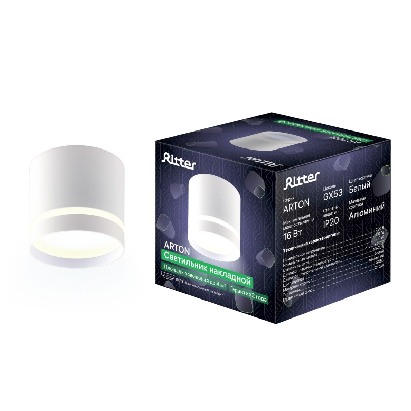 Наименование для 1С | Свет-к накладной, ARTON, цилиндр, 85х80мм, GX53, алюминий, белый, 59942 5, Ritter |
