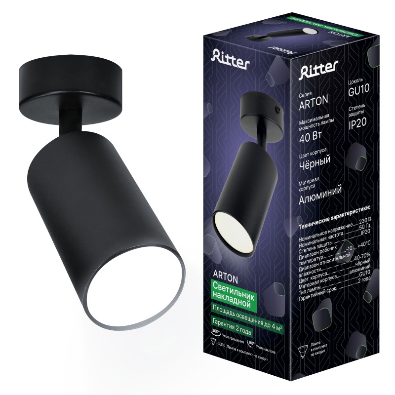 Наименование для 1С | Свет-к накладной, ARTON, поворотный, цилиндр, 55х165мм, GU10, алюминий, черный, 59965 4, Ritter |