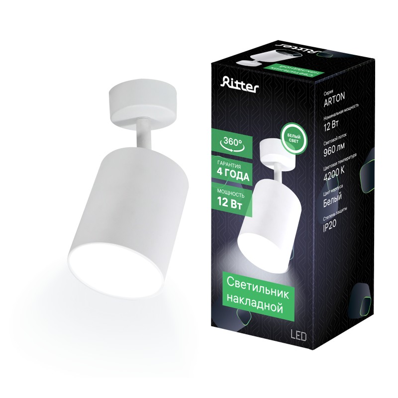 Наименование для 1С | Свет-к накладн сд, ARTON, поворотн цилиндр 80х100мм LED 12Вт 960Лм 4200К Al белый 59974 6, Ritter |