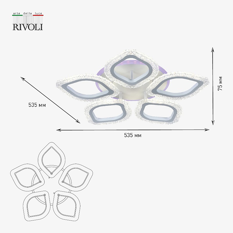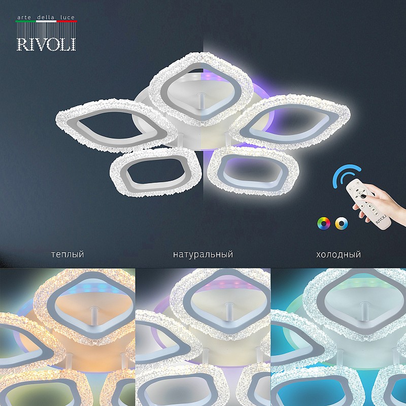 <p>Потолочный светодиодный светильник Rivoli Dietlinde с дистанционным управлением. Пульт ДУ в комплекте, есть возможность управления со смартфона. LED-люстры Dietlinde оснащены функциями регулировки яркости, смены цветовых температур, а также встроенной светодиодной подсветкой формата RGB.</p><p>Светодиодная люстра Rivoli Dietlinde прекрасно впишется в любой современный интерьер. Положительные отзывы собирает ее дизайн футуристичный и сдержанный одновременно. Итальянский бренд Rivoli создал оригинальный светильник потолочный светодиодный с корпусом в виде эффектного белого цветка со светящимися лепестками. Размер светодиодной люстры - 535*535*75 мм. Яркое ровное освещение данной люстры в гостиную создают мощные долговечные светодиоды последнего поколения. </p><p>Выбирая люстру в спальню, стоит купить именно этот вариант (арт. 6049-105). Когда вы отдыхаете, удобно дистанционно управлять освещением сделать яркость поменьше, изменить скорость и оттенки