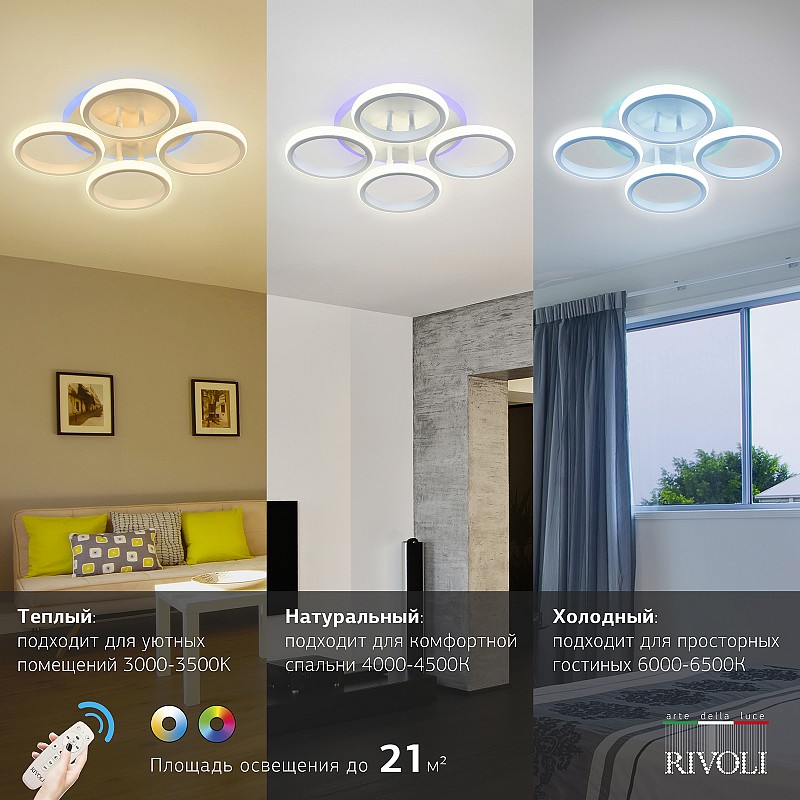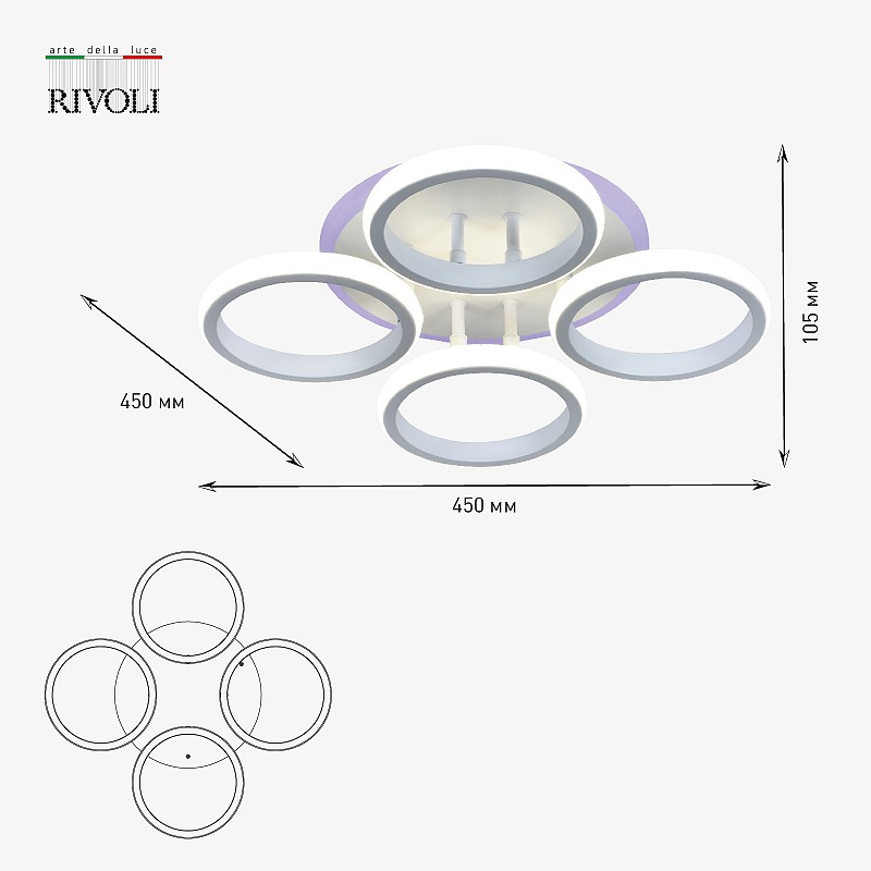 <p>Светильник потолочный LED Irmtrud от итальянского бренда Rivoli поставляется с пультом дистанционного управления в комплекте. С помощью пульта или приложения в смартфоне вы можете дистанционно изменять яркость данной светодиодной люстры, ее цветовую температуру, а также управлять встроенной RGB-подсветкой.</p><p>Разноцветная RGB-подсветка делает освещение в комнате особенно эффектным. Оригинально выглядит и сам корпус люстры, изготовленный из легкого прочного металла, акрила, силикона. Футуристичный внешний вид светильнику на потолок Rivoli Irmtrud придает гармоничное сочетание нескольких светящихся окружностей. Размеры этой красивой LED-люстры: 450*450*105 мм. Стоит купить такой практичный потолочный светильник на кухню, в спальню, гостиную, в детскую, прихожую, коридор.</p><p>Успейте заказать современную люстру LED на потолок по доступной цене!</p>