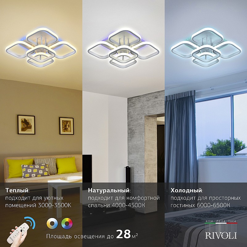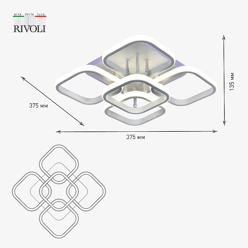 <p>LED-люстра Hedwig от итальянского бренда Rivoli с дистанционной регулировкой яркости, выбором цветовой температуры и встроенной разноцветной RGB-подсветкой. Стоит купить такой практичный и эффектный светильник светодиодный потолочный для ремонта в стиле хай-тек, минимализм, модерн и любых современных пространств.</p><p>Размеры современной люстры Rivoli Hedwig - 375*375*135 мм. Хороший вариант люстры в гостиную или люстры в спальню. Не вставая с дивана или кровати можно регулировать освещение под конкретные задачи и настроение: приглушить яркость, включить романтичную подсветку, включить или выключить свет.</p><p>В качестве источников света LED-cветильника на потолок Hedwig применены яркие и долговечные светодиоды последнего поколения. Вы оцените их ровный свет без пульсаций и мерцания. С течением времени светодиоды этой качественной люстры не тускнеют и не нуждаются в замене. Корпус люстры на кухню Rivoli Hedwig изготовлен из прочного легкого металла у