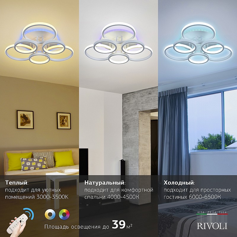 <p>Светильник светодиодный на потолок Paula (арт. 6088-106) от итальянского бренда Rivoli. Имеет стильный футуристичный дизайн в виде эффектной комбинации светящихся кругов. Свет LED-люстры Paula ровный и яркий за счет применения самой современной светодиодной технологии.</p><p>В комплекте пульт дистанционного управления. С его помощью, а также при помощи специального приложения в вашем смартфоне, вы сможете с комфортом управлять освещением в вашем доме изменять яркость люстры Rivoli Paula и цветовую температуру света теплый, холодный или нейтральный белый.</p><p>Ещё одно преимущество светодиодной люстры Paula встроенная RGB-подсветка, режимами которой также можно управлять. Разноцветное дополнительное свечение потолочного светодиодного светильника завораживает и придает пространству современное звучание. </p><p>Смена типа освещения позволяет решать самые разные задачи в одной и той же комнате, где есть люстры LED от Rivoli, можно полноценно отдыхать, работать или учиться. </p>