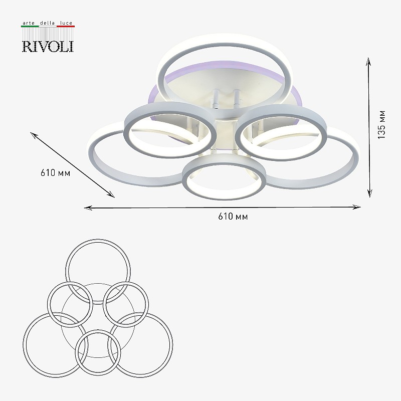 <p>Светильник светодиодный на потолок Paula (арт. 6088-106) от итальянского бренда Rivoli. Имеет стильный футуристичный дизайн в виде эффектной комбинации светящихся кругов. Свет LED-люстры Paula ровный и яркий за счет применения самой современной светодиодной технологии.</p><p>В комплекте пульт дистанционного управления. С его помощью, а также при помощи специального приложения в вашем смартфоне, вы сможете с комфортом управлять освещением в вашем доме изменять яркость люстры Rivoli Paula и цветовую температуру света теплый, холодный или нейтральный белый.</p><p>Ещё одно преимущество светодиодной люстры Paula встроенная RGB-подсветка, режимами которой также можно управлять. Разноцветное дополнительное свечение потолочного светодиодного светильника завораживает и придает пространству современное звучание. </p><p>Смена типа освещения позволяет решать самые разные задачи в одной и той же комнате, где есть люстры LED от Rivoli, можно по
