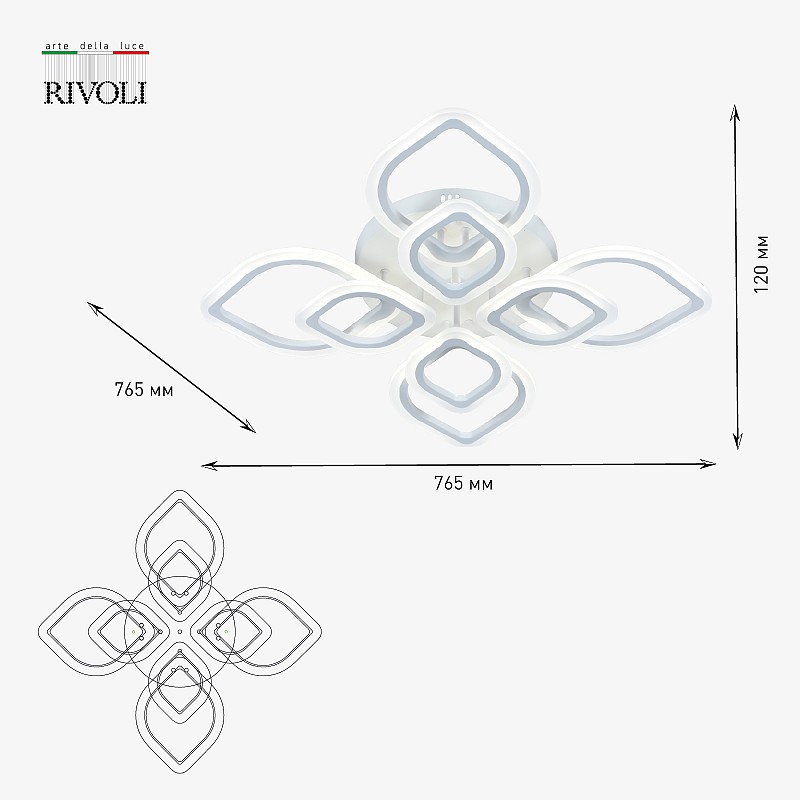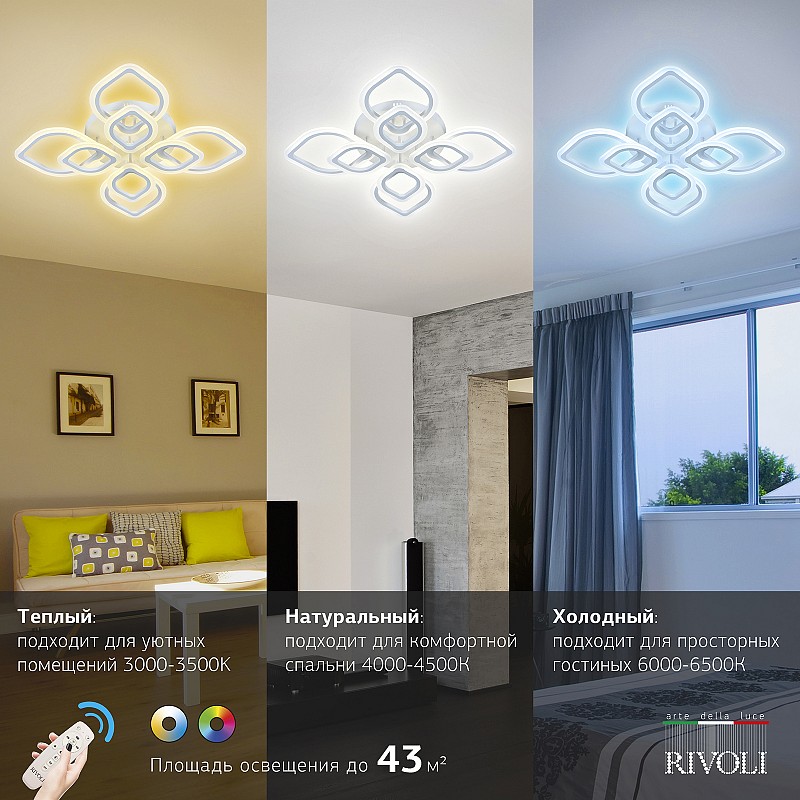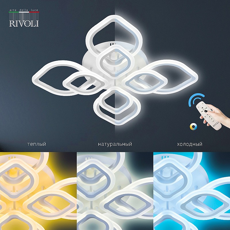 <p>Светодиодный светильник Rivoli Elena (арт. 6092-108) стильный светящийся цветок на вашем потолке! Поставляется с пультом дистанционного управления. Можно регулировать яркость этой функциональной люстры, выбирать цветовую температуру в диапазоне 3000 6000 К. Созданная итальянскими дизайнерами люстра потолочная светодиодная Elena великолепно впишется в интерьер современной квартиры или загородного дома. Стоит купить такой LED-светильник потолочный для пространств в стиле хай-тек, модерн, минимализм.</p><p>Управлять освещением на расстоянии очень удобно. Купив LED-люстру Elena на потолок в гостиную или в спальню, вы сразу заметите, насколько комфортной стала ваша жизнь. Теперь ничто не нарушает отдых! Не вставая с кровати, можно включить или выключить свет, приглушить освещение, выбрать теплую, холодную или нейтральную температуру света.</p><p>Размеры люстры светодиодной потолочной Rivoli Elena - 760*760*120 мм. Световой поток - 7425 Лм.</p>