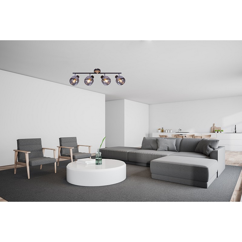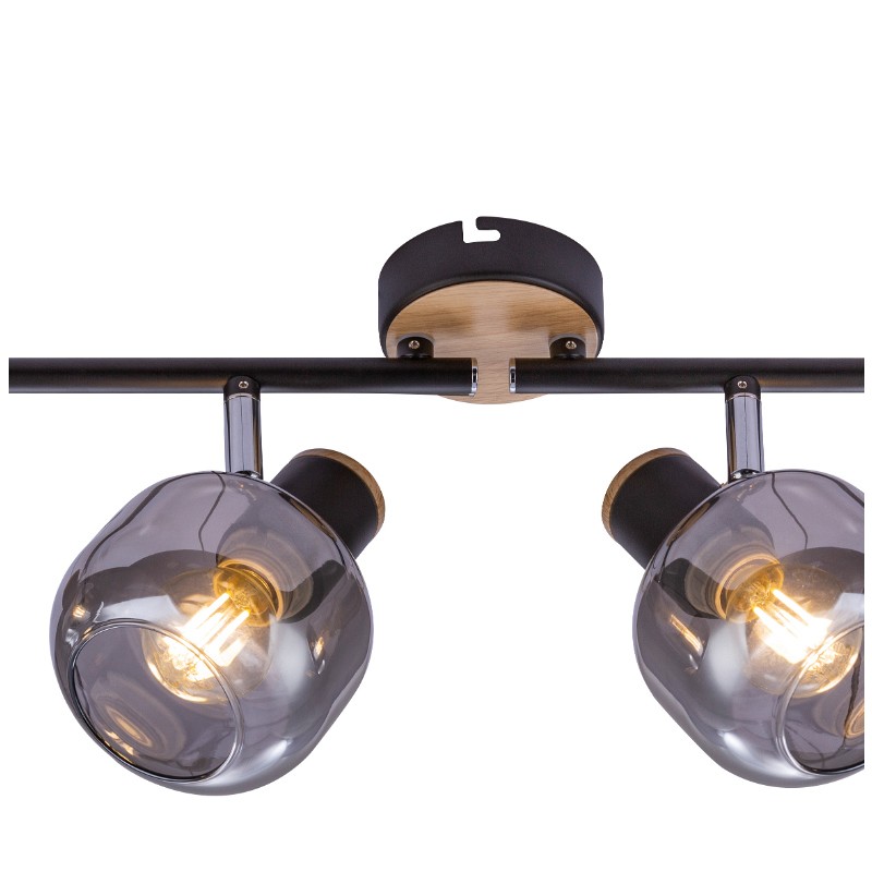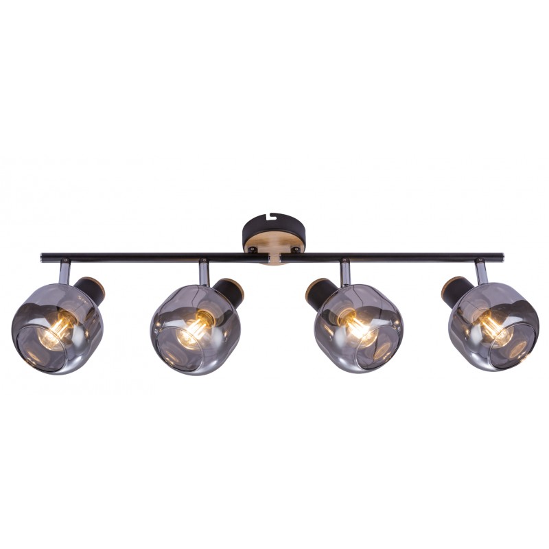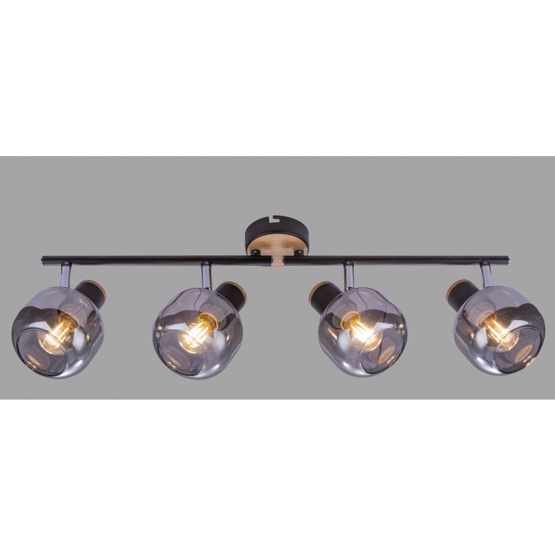 <p>Броский дизайн этих светильников достигается сочетанием контрастных оттенков затемнённых выдувных плафонов и тёмного металлического каркаса с декоративными элементами из светлого дерева. Споты оснащены долговечными поворотными механизмами высокого качества с надёжной фиксацией. Коллекция представлена настенно-потолочным светильником на 4 лампы.</p>