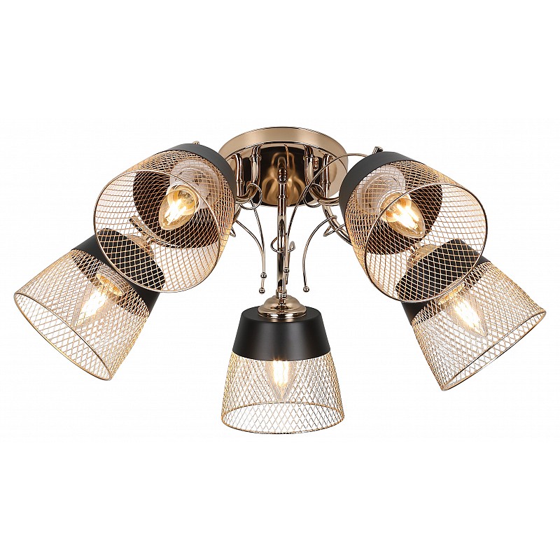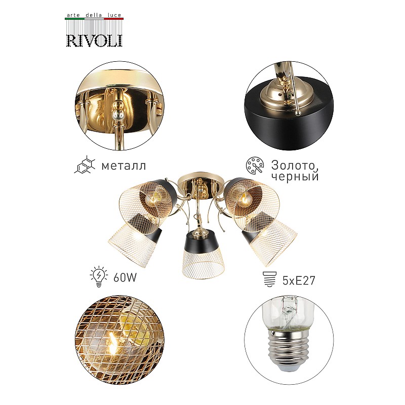<p>Хельма древнее европейское женское имя. Серия люстр и подвесов Rivoli Helma, как и положено жительнице Европы, проста и самобытна, но в нужной ситуации может подчеркнуть свой лоск и благосостояние. Сетчатые плафоны на манер садовых плетёных абажуров покрыты золотистым напылением. Композицию уравновешивают сдержанные чёрные основания ламп. Коллекция представлена потолочной 5-ти рожковой люстрой.</p>