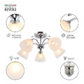 <p>Люстры потолочные Liselotte - новинка итальянского бренда Rivoli. Созданы в рамках серии "Лайт", в которую входят простые недорогие люстры европейского дизайна. Если вам хочется быстро и с минимальными затратами обновить интерьер - вы смотрите фото правильной люстры! Данная модель имеет 5 белых матовых плафонов из стекла. Освещаемая площадь этой люстры - 15 м². Идеально для стандартной кухни, спальни, детской, небольшой гостиной. Фишкой в декоре люстры в гостиную Liselotte (арт. 9076-305) стали тоненькие веточки из металла, которыми украшен корпус.</p><p>Для окрашивания арматуры этой люстры на кухню выбран модный цвет хром. Будьте уверены - эта люстра хорошо впишется на потолок вашей современной квартиры! При этом не выйдет из моды, ведь традиционная форма плафонов-колокольчиков актуальна во все времена. Такие плафоны направляют свет вниз, грамотно концентрируя световой поток. Коллекцию дополняют люстры в спальню под 3 лампы арт. 9076-