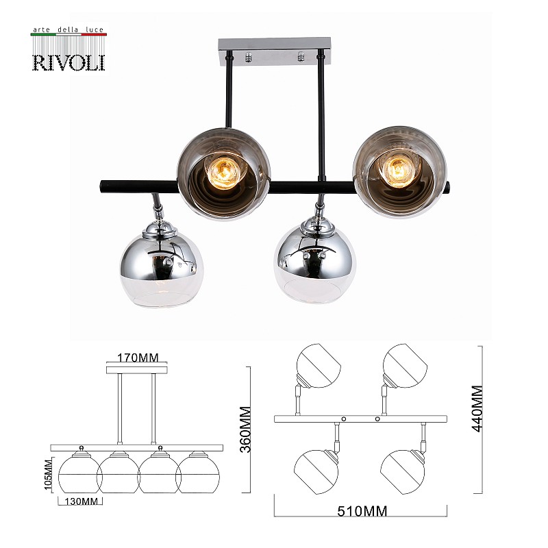 <p>В коллекции Rivoli Eduarda есть люстры потолочные с 4 плафонами (арт. 9100-304) и люстры потолочные с 6 плафонами (арт. 9100-306). Данная люстра на потолок применяется с 4 источниками света Е27 60 Вт. Освещаемая площадь от этой люстры - 12 м². Размеры люстры - 510*440*360 мм. Лаконичная арматура окрашена стойким гальваническим методом в трендовое сочетание - черный и хром.</p>