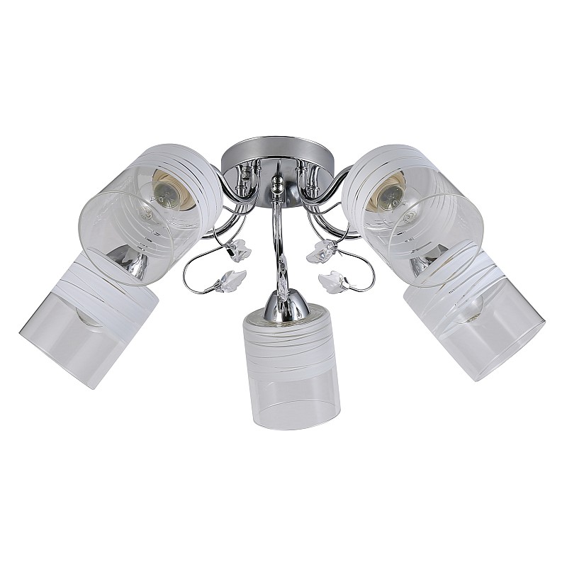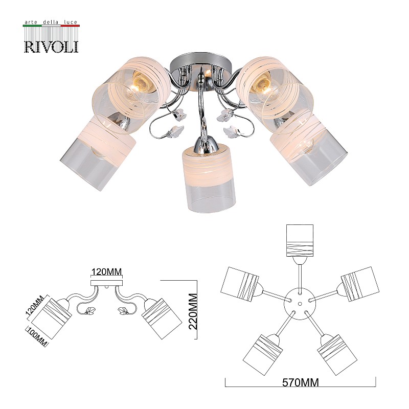 <p>Итальянский бренд Rivoli создал красивую коллекцию универсальных люстр в традиционном стиле. Люстры потолочные Fabiana под 3, 5 и 8 ламп (артикулы 9102-303, 9102-305 и 9102-308) привнесут в ваш дом красоту и создадут качественное освещение. Данная люстра на потолок с 5 плафонами отлично осветит комнату средней площади - около 15 м². Традиционные плафоны-стаканчики изготовлены из качественного прозрачного стекла с элементами матового покрытия. Нежные тонкие полоски на стекле смотрятся очень гармонично. Арматура эффектного цвета хром украшена декоративными веточками из металла с утонченными стеклянными бутонами. Металлический корпус люстры окрашен гальваническим способом, это надолго сохраняет эффектный оттенок, блеск и аккуратный внешний вид люстры в гостиную. </p>