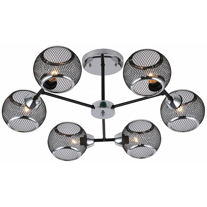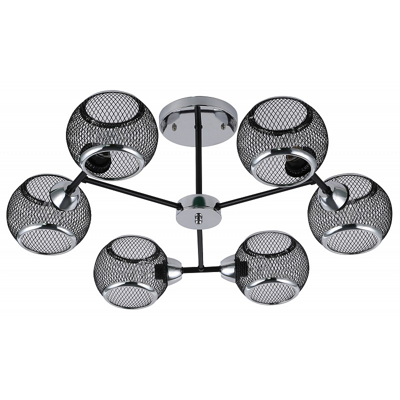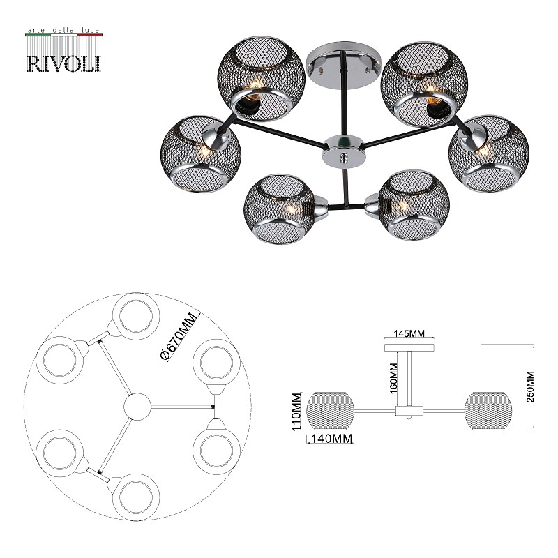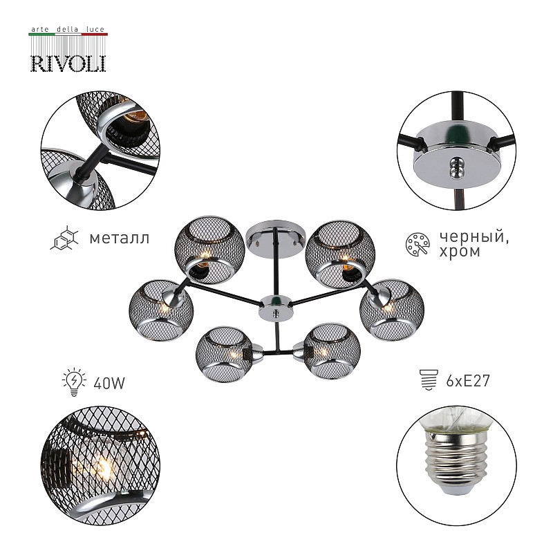 <p>Rivoli Morrigan (арт. 9143-306) - люстра на потолок с 6 металлическими сетчатыми плафонами округлой формы. Такие люстры - популярное решение для современных интерьеров. Плафоны из легкого прочного металла базового черного цвета расположены по кругу, лампочки эффектно направлены в сторону. Люстра в гостиную Morrigan отлично распределяет свет в комнате, создает эффектные световые узоры за счет решетчатой структуры плафонов. Шесть источников света - оптимальное решение для люстры в жилую комнату. Рекомендованные лампы для данной люстры в спальню, люстры на кухню - Е27 40 Вт. </p>