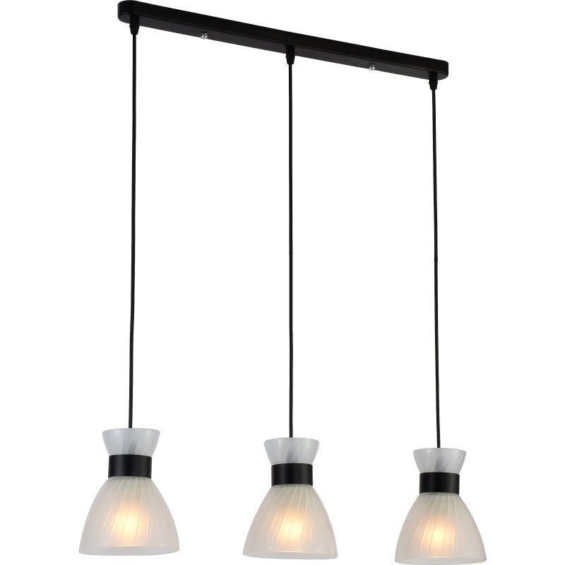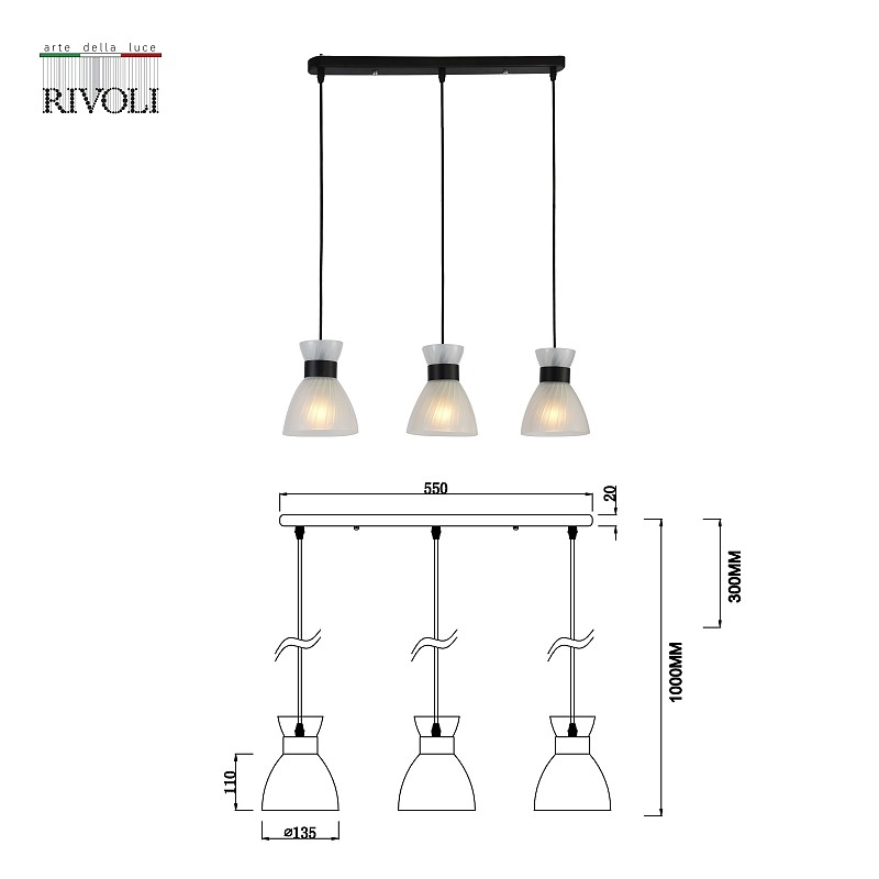 <p>Светильники потолочные подвесные Alma Rivoli имеют 3 стеклянных плафона-трапеции, расположенных на единой рейке базового черного цвета. Черные тросы подвесных светильников над столом Alma от итальянского бренда Rivoli при монтаже можно отрегулировать по высоте. Плафоны из матового белого стекла с узором в виде аккуратных вертикальных полос контрастно декорированы черным кольцом из металла. Металлическая рейка, объединяющая 3 дизайнерских плафона, отлично подходит для установки на кухне, делая подвесные светильники Alma идеальным решением над столом. Один подвесной светильник Rivoli Alma под 3 лампы Е27 60 Вт хорошо освещает столешницу и подсвечивает площадь до 9 м2. В коллекции Rivoli Alma есть светильник подвесной с 1 плафоном в формате подвесной люстры - арт. 9158-201. </p>