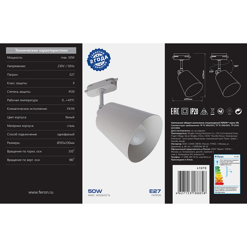 Светильники трековые на шинопровод E27, однофазный (ИВО) FERON AL158, 50W, 230V, цвет белый, корпус сталь, вращение →350°/↓180°, 105*105*230 мм