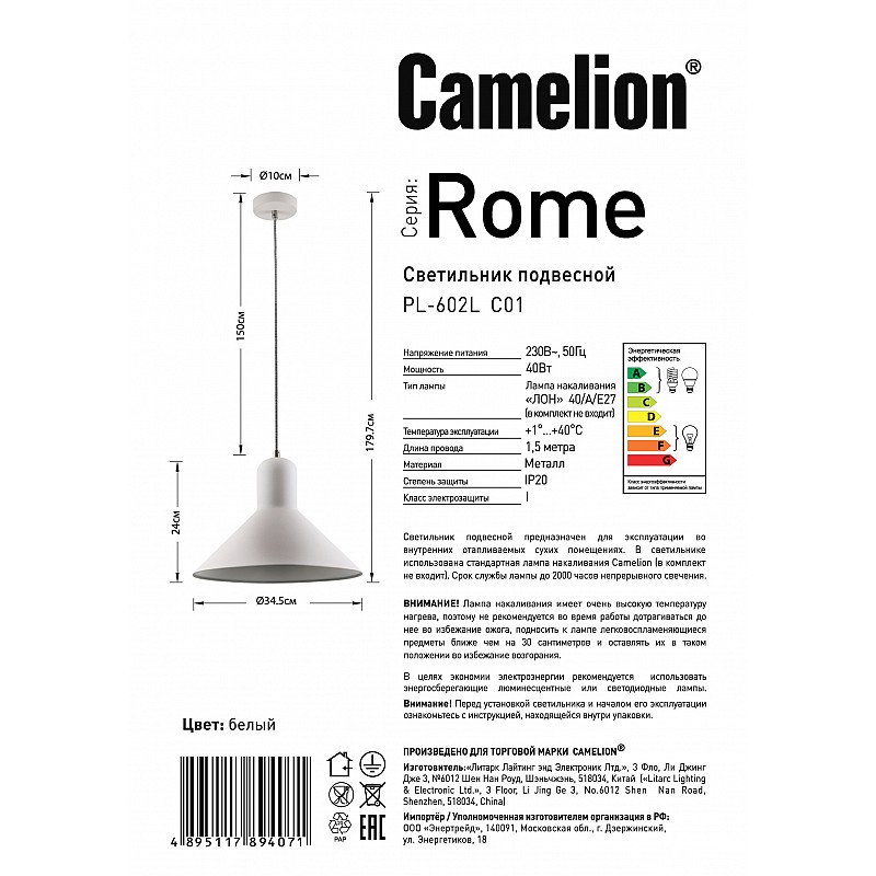 Светильники стационарные подвесные для использования с лампами накаливания предназначены для подсветки интерьеров квартир, загородных коттеджей, кафе и ресторанов. PL-602L C01 белый , серия Rome , размер 1797х345х345 мм, источник света - ЛОН,LED,КЛЛ тип лампы - 40/A/E27, патрон - E27, мощность 40Вт, ~230 В, 50 Гц. диаметр металлического плафона 345 мм, высота плафона - 240 мм. Фактурная бархатистая окраска. Высота провода- подвеса ( макс.- 1550 мм) регулируется.
