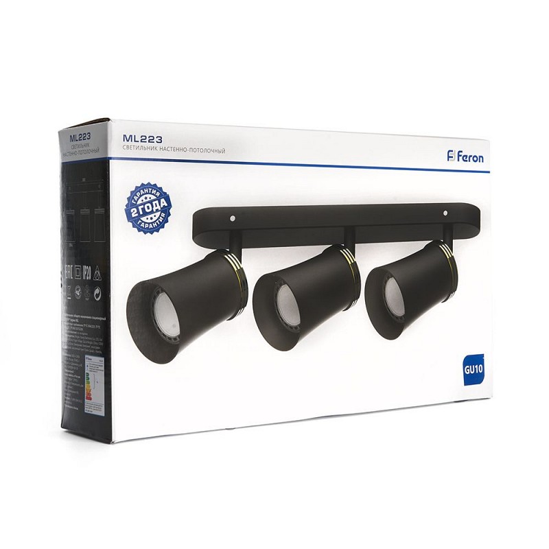 Светильник накладной под лампу, (ИВО) FERON ML223, 3*GU10 3*50W, 230V, IP20, цвет черный, корпус алюминий, 300*66*180